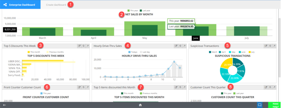 By default, you will see the Enterprise Dashboard. If you have created any other dashboards, you will see them as tabs at the top of the screen. The Dashboard is broken down into several different sections as follows: