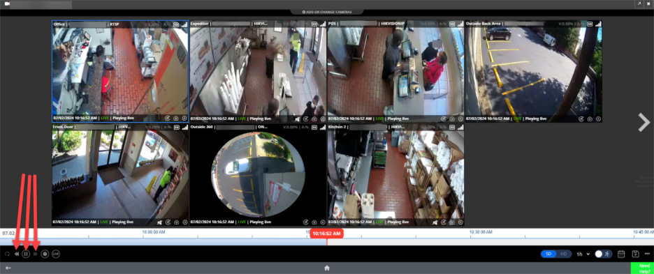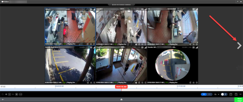 When accessing video for a location for the first time, you will see 6 cameras on your screen. If you want to view different cameras, click on the side arrows, which will take you to the next set of 6 camera views.