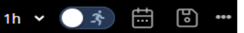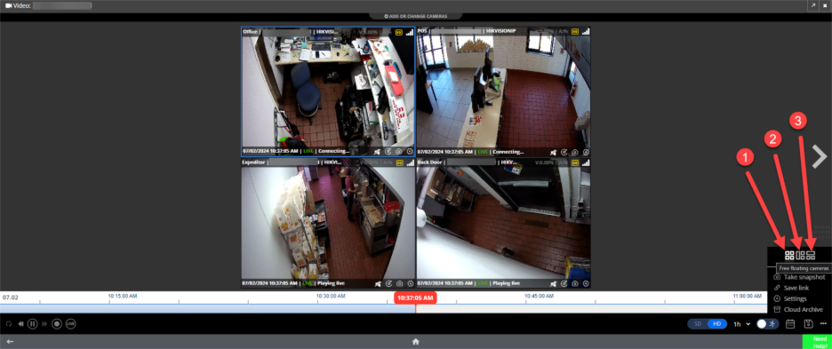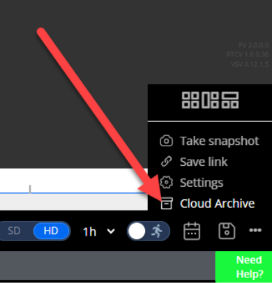 On the right-hand side, you will see options as follows: 1h (hourly time increments) to adjust the time scale of the scrub bar, a running man icon to toggle on motion detection, a calendar to access historical video, and more options to change the camera view (rectangles and squares), Take snapshot, Save link, change Settings (see below), and access the Cloud Archive.