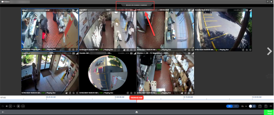 To add an additional camera view, hover over the + Add or Change Cameras icon located on the top center of your screen to see additional camera options. To add a camera, drag the desired camera to the empty gray areas of the screen. You can also drag cameras out of view by placing them back in the tray.