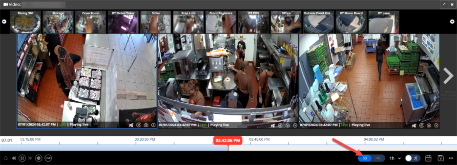 You can switch between Standard Definition (SD) and High Definition (HD) video quality by clicking on the top-right section of the camera view. 360iQ presents camera views in Standard Definition by default to save on your Internet bandwidth usage.