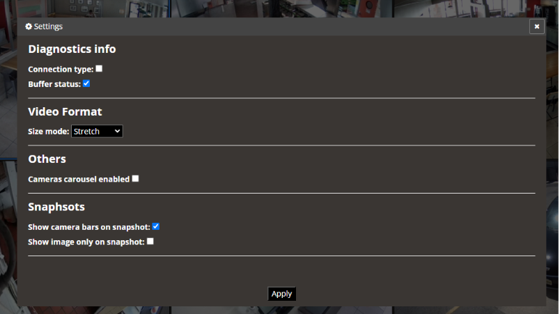 On the top right-hand corner of each camera view, you will find the percentage of the buffer that has been filled for Video (V), the percentage of the buffer that has been filled for Audio (A), the Video quality toggle, and the network connection status.