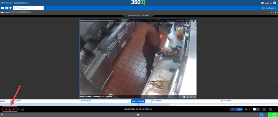 Within live or historical videos, you can navigate the footage frame by frame. Use the scrub bar to select the footage you want to view. In the bottom-left corner, press the Pause button to pause the video. Then, press the buttons on either side of the Play button to Step Backward or Step Forward one frame at a time.