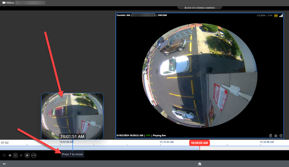 To alter a specific camera view, select the video manipulation button located at the bottom right-hand corner of the camera view. When video manipulation is enabled, the button will turn blue. You can use your mouse or touch pad to scroll up/down or to zoom in/out.