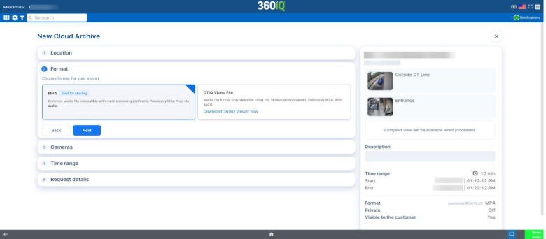 Once you have selected your format, click Next. Select the cameras for which you want to create the Cloud Archive, then click Next. Select your desired time range and click Next to move on to the final step.