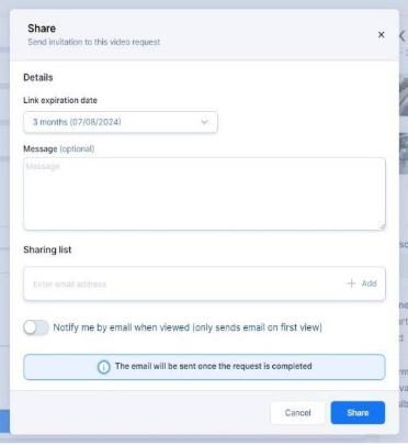 If you would like to share the Cloud Archive once it has finished processing, toggle Share when completed on. In the pop-up menu, choose your Link expiration date, message, and email Sharing list. You can also toggle Notify me by email when viewed (only sends email on first view) on to receive a message when someone opens your new Cloud Archive. Once you have made your selections, click Share.