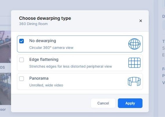 If you are creating a Cloud Archive using a 360-degree camera, you will be presented with the following dewarping options: