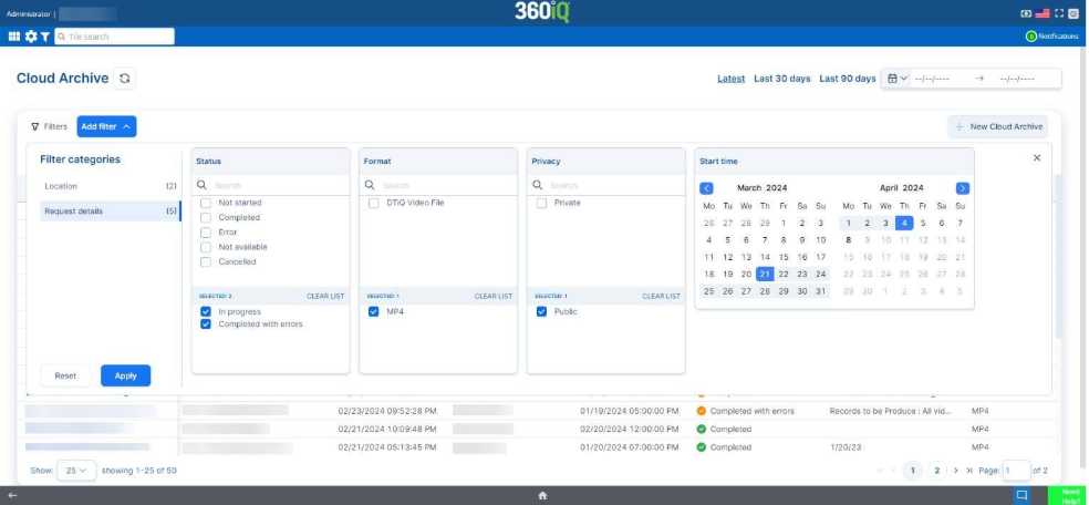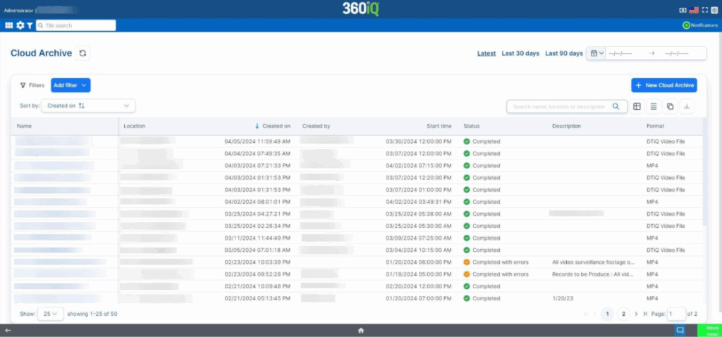 In the Cloud Archive, you can access historical video records for locations and dates of your choice. You can also Add filters and create a New Cloud Archive.
