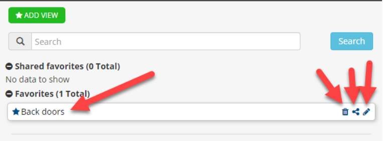 To delete, share, or edit Favorites, simply click on the corresponding blue icons on the right-hand side of your Favorite.