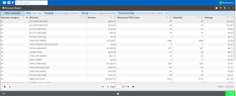 In the Discount Report overview, you will find a list of all your organization’s discounts. These discounts are arranged by Discount category, Discount, Amount, Discounted TRX Count, Quantity, and Average.