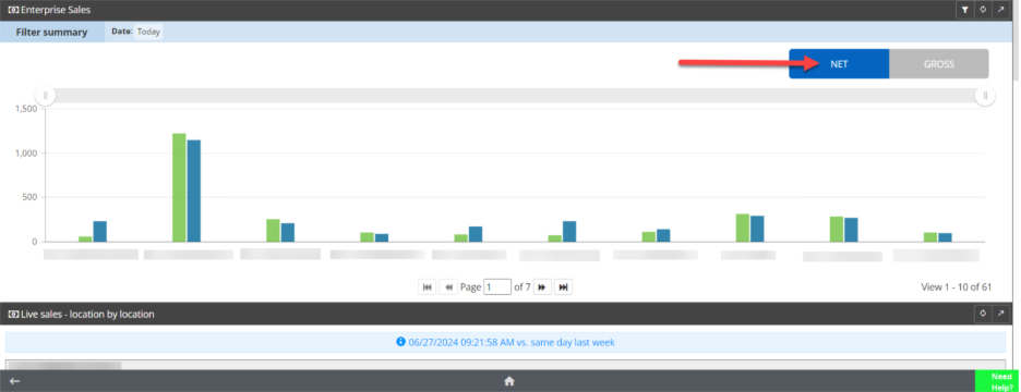 To choose between Net and Gross transaction values, click on the Net or Gross buttons in the upper right-hand corner.
