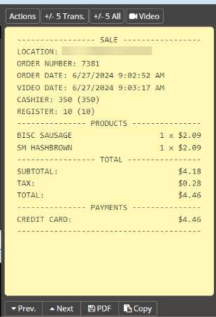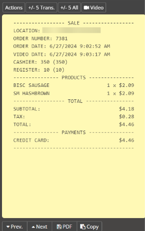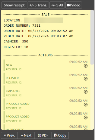 Click the Actions button, located in the upper left-hand corner of the digital receipt, to see a transaction breakdown by action performed at the point-of-sale register. This feature can save you time when reviewing video of a transaction by allowing you to go directly to the moment of payment.