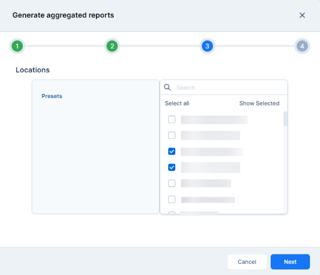 Choose your desired Locations. Click Next to move on to the final step in the report generation process.