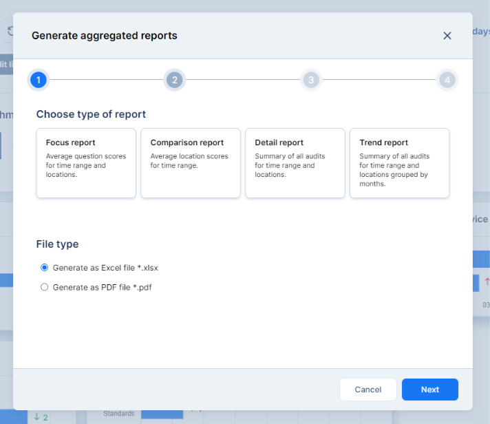 The Generate aggregated reports window will open. You can choose from various unique report options to suit your needs, including a Focus report, Comparison report, Detail report, and Trend report. When you are ready to move on, click Next.