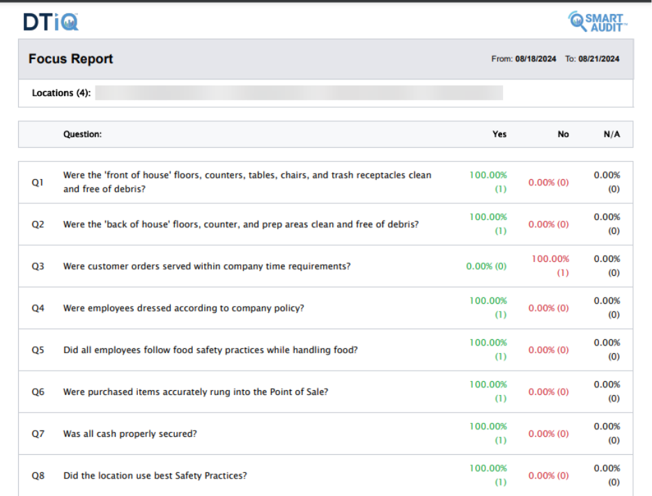 A SmartAudit™ is a customizable 10-question remote audit that provides insights on how to improve your business operations. The SmartAudit™ feature requires an active subscription. Contact DTiQ Support at support@dtiq.com or your Customer Success Manager at csr@dtiq.com to learn more.