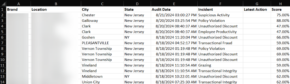 The Incident report will be downloaded to your computer as an .xlsl (Excel) file. You will most likely find it in your Downloads folder. Once opened, the report should look something like this: