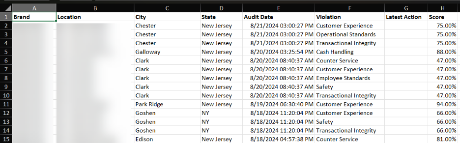 The Violations report will be downloaded to your computer as an .xlsl (Excel) file. You will most likely find it in your Downloads folder. Once opened, the report should look something like this: