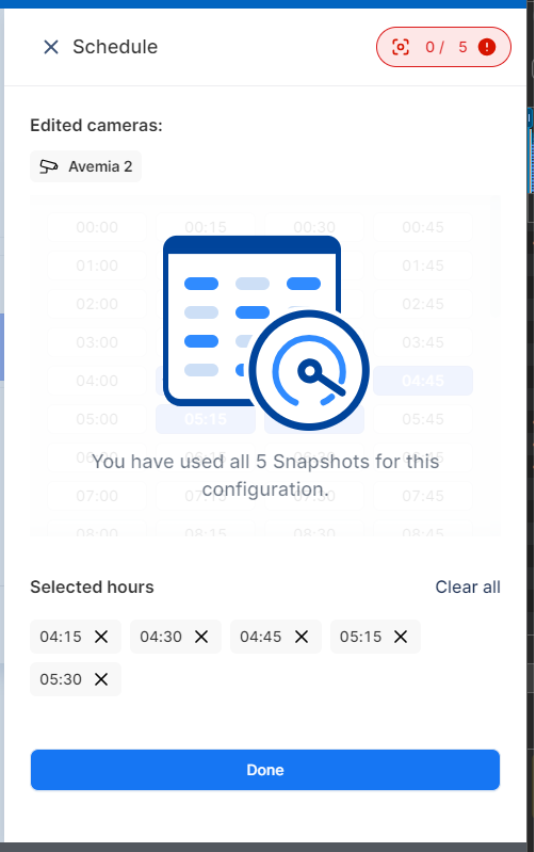 - A new window will pop up. Here, you can view your snapshot Schedule, along with your Edited cameras. Below, you will see a table of times to choose from. Once you have made your selections, they will appear at the bottom of the screen under Selected hours.