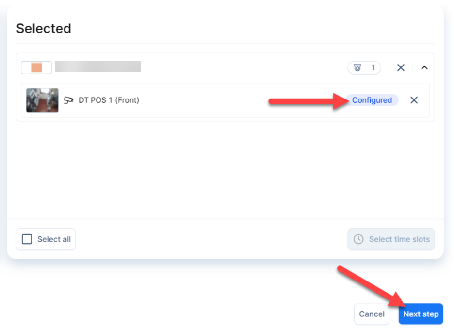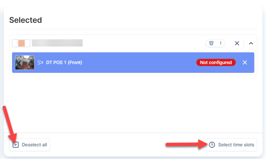- Click on the cameras you want to configure individually or check the Select all box to configure them all at once. Then, click Select time slots.