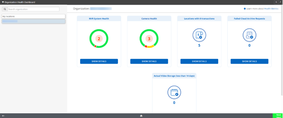 The Organization Health Dashboard includes metrics such as NVR System Health, Camera Health, Locations with 0 transactions, and Failed Cloud Archive Requests.