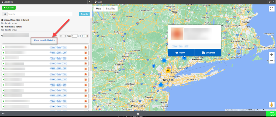 You can Search by location name using the search box in the upper left-hand corner of the screen. Administrator Role users can review Health Metrics and go directly to the Organization Health Dashboard by clicking Show Health Metrics, then VIEW DASHBOARD